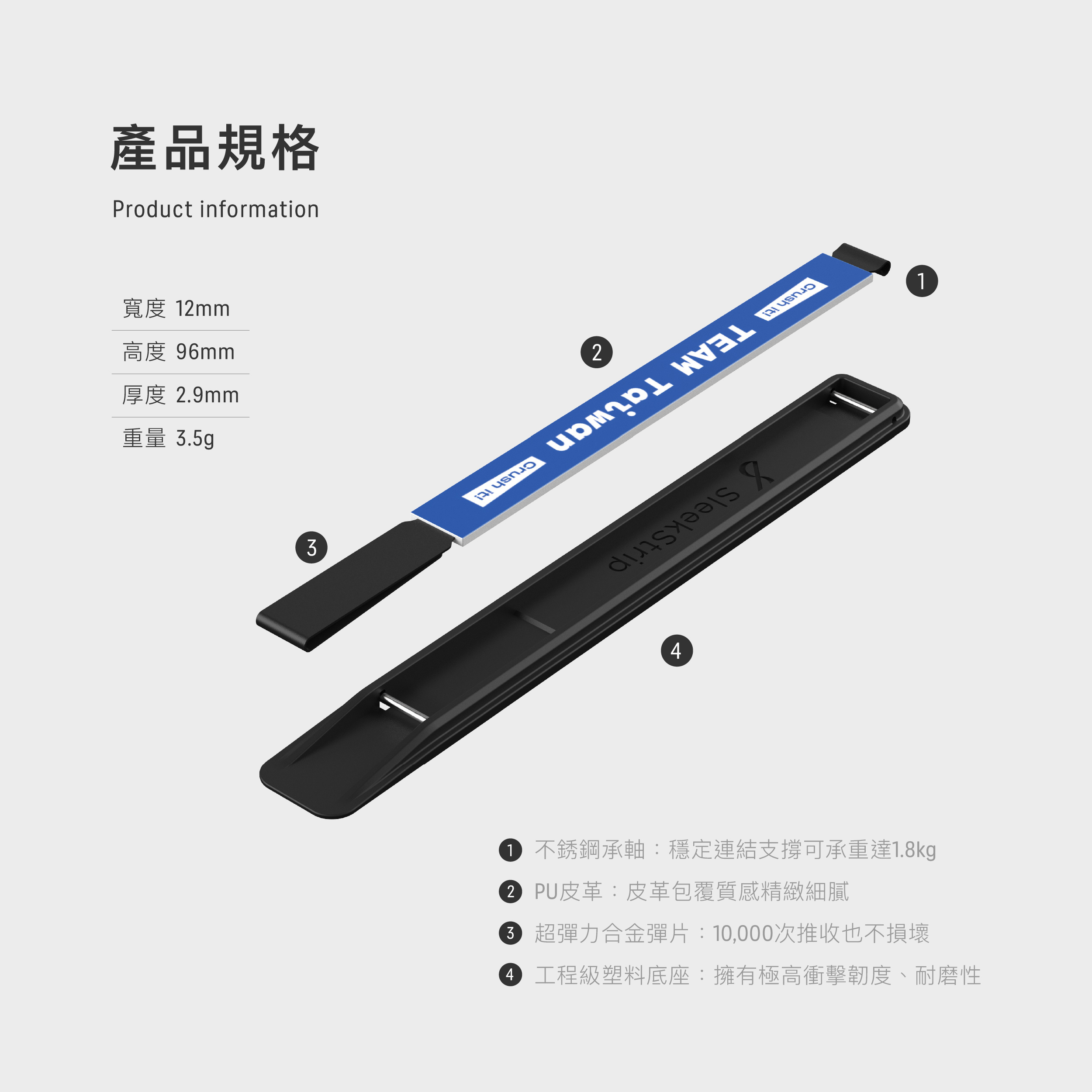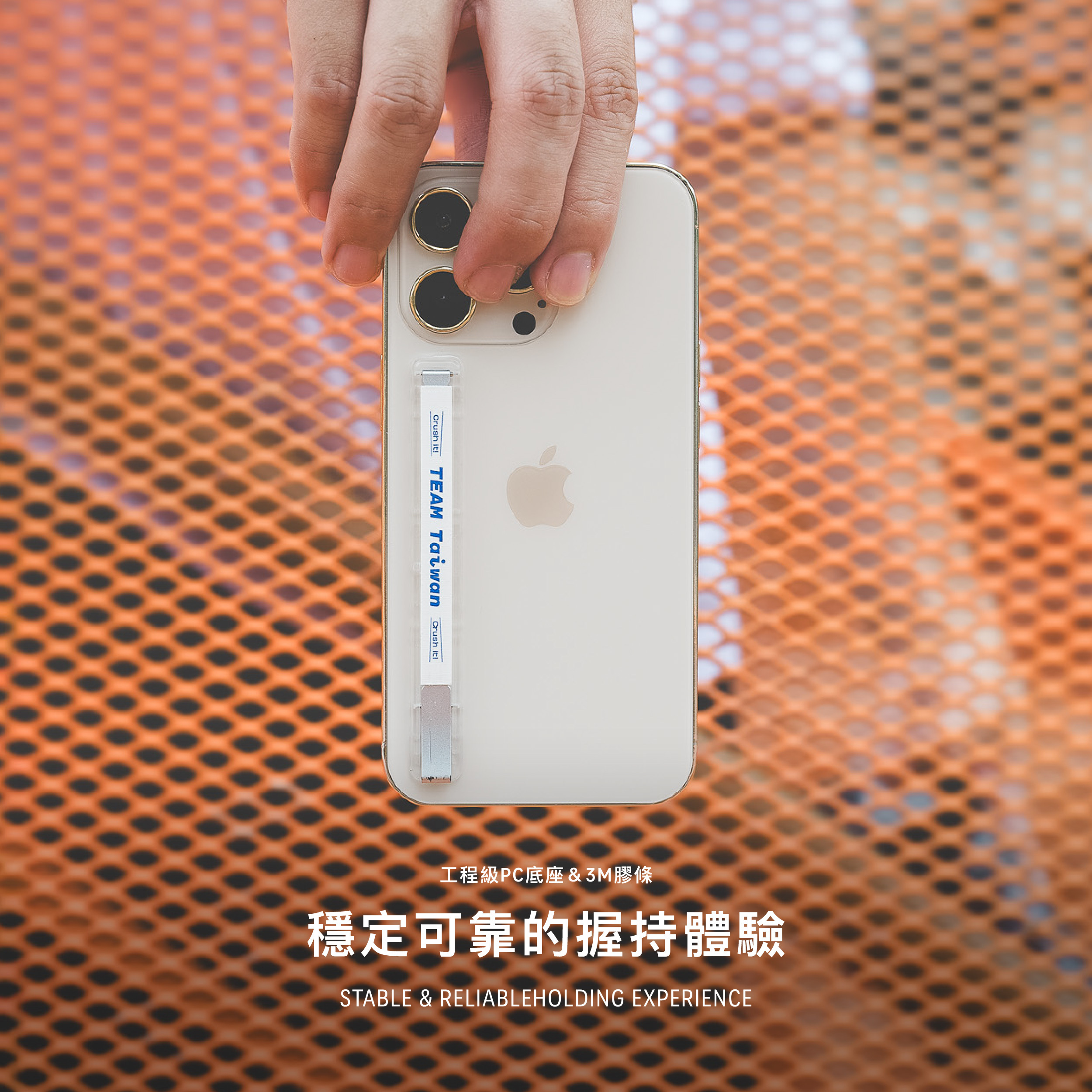 SleekGrip Essential 輕量款手機握帶支架 採用了工程級PC材質作為底座,提供卓越的耐用性和可靠性。PC材質不僅堅固,還能有效地抵抗日常使用中的磨損和衝擊,確保你的手機能夠長時間保持最佳狀態。無論是日常使用還是極限環境下,SleekGrip Essential 輕量款手機握帶支架 都能提供穩定的支撐。